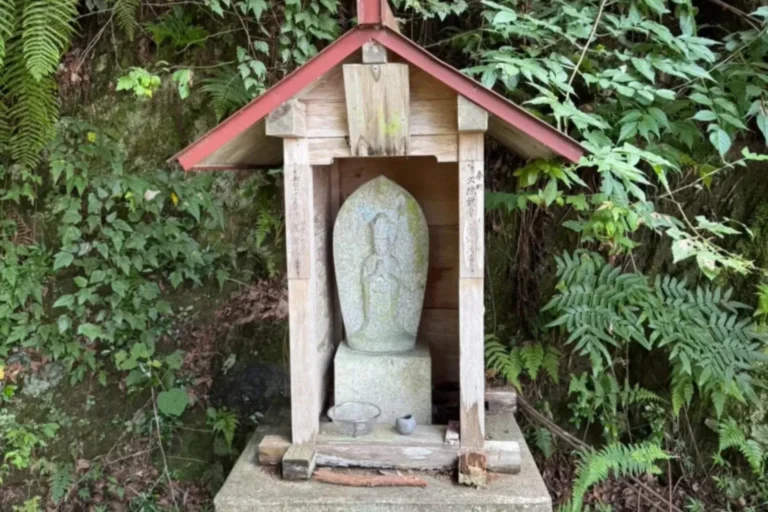 華厳寺から山道を40分ほど歩くと、十一面観音が祀られた奥の院に着きます。小さな観音堂が並ぶ道はとても静かで、鳥の声と川の音が聞こえます。さらに上には「不動明王」のお堂と「妙法ヶ窟」があり、湧き水で墨をすれば書が上達すると言われています。