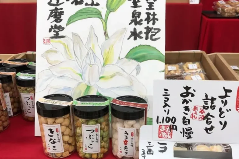 地元の老舗「だるま堂製菓」の直売所です。国産のもち米ときれいな地下水で作った100種類以上のあられが並びます。カリッと香ばしく、どれも日本らしい味わい。お土産にも人気で、伝統のお菓子作りを間近で見ることもできます。